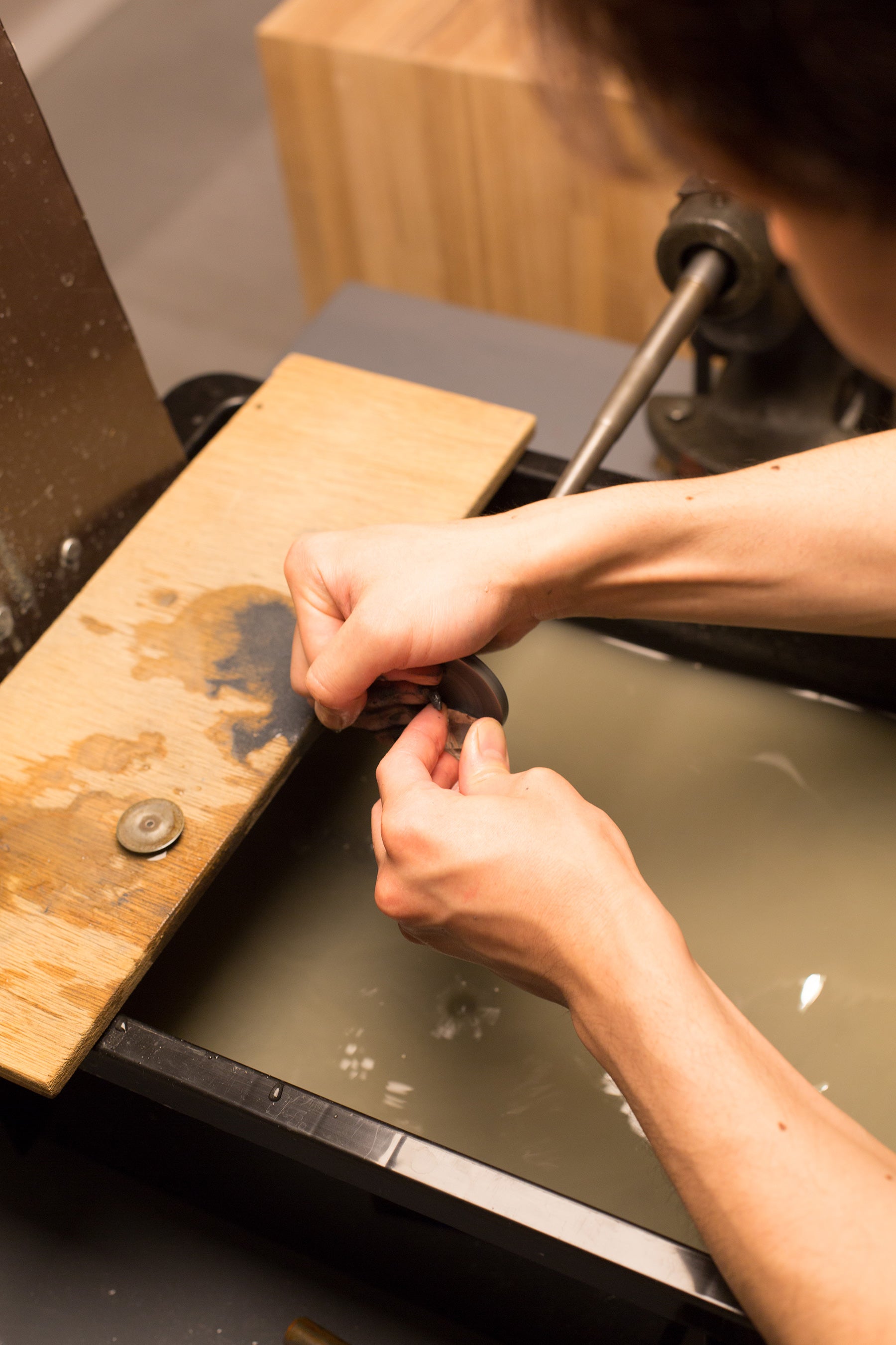 水晶が産出したことから優れた研磨技術が発展した山梨県甲府市で香炉や仏像を作ってきたのが貴石彫刻オオヨリです。水晶彫刻は研磨の砂をかけながら行うために、削っている間は手元のデザインが見えません。でも職人は指先の感覚だけで丸みや尖り具合など繊細なディテールを把握しながら削り出していきます。石によって硬さや性質が違うものひとつひとつを感じながら、決して失敗が許されないひと削りごとを丁寧にまるで対話するように仕上げるからこそあの輝きが生まれるのです。