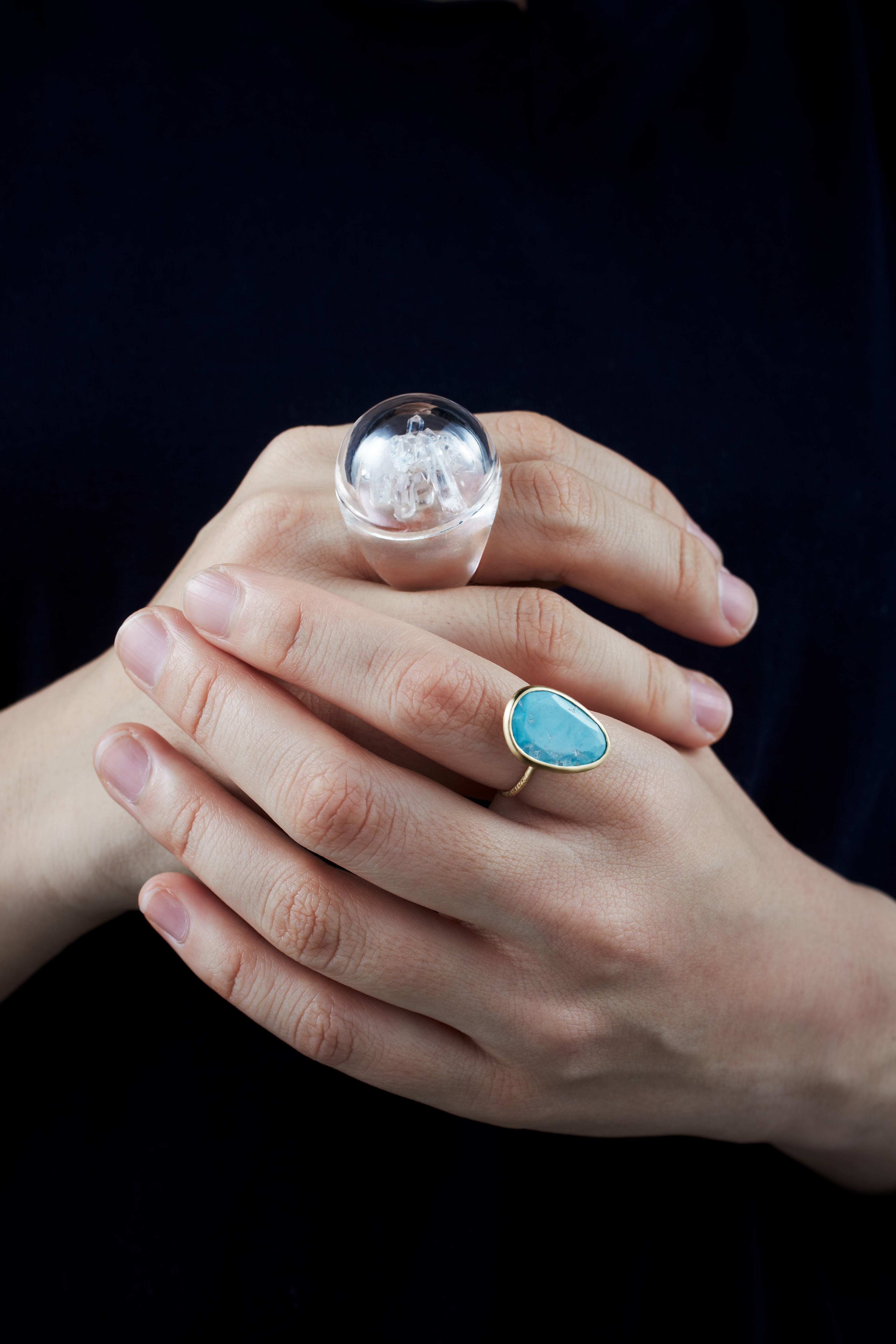 仏像を彫るほどの技術を使って、大寄智彦が生み出したいもの。それはつけた時にさらに輝きを増すストーンジュエリー。たとえば透明なドーム型のジュエリー。これは水晶を丸く空洞に削り、中に原石を入れてさらに水晶のリングで閉じるという技が詰まったものでまるでアートピースを身につけるかのようです。また、日常で気軽に石を纏う楽しさを味わえる枠包みのリングは、一見シンプルですが、石のぷっくりとしたとろみのあるカーブはつけた時に目を惹きます。
